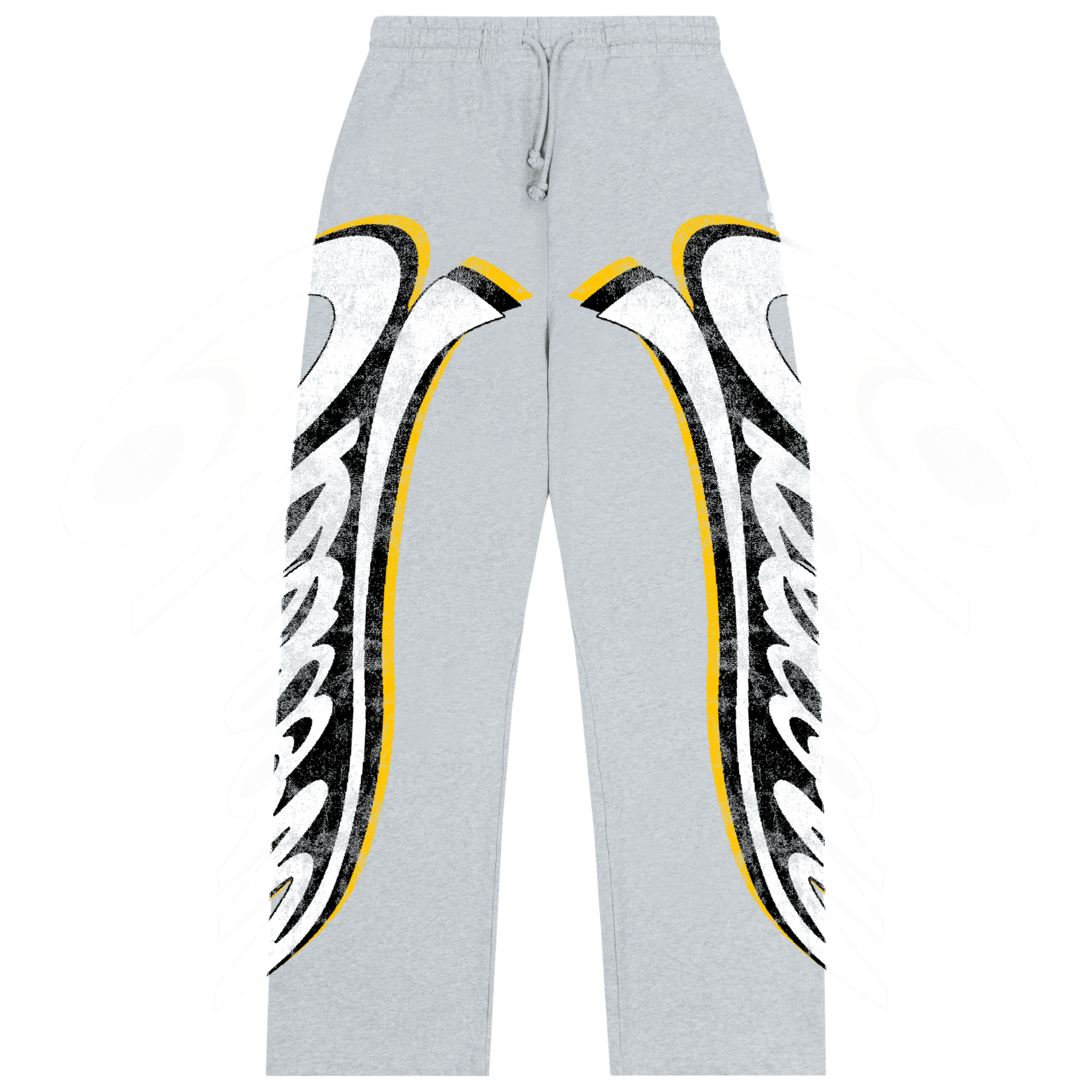 These vintage everyday sweat pants feature a relaxed fit with an open bottom design for easy wear and comfort. Crafted from soft grey fabric, they showcase a distinctive vintage screen print running down the side, adding a touch of retro style to your casual wardrobe. Perfect for everyday comfort with a unique vintage flair.